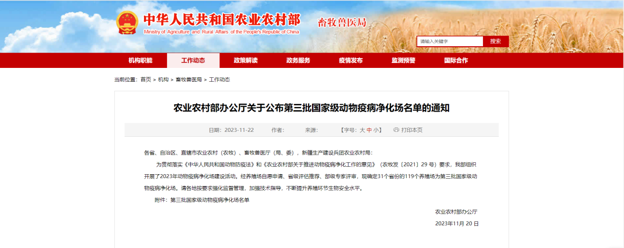 11月20日,農(nóng)業(yè)農(nóng)村部辦公廳發(fā)布第三批國家級動(dòng)物疫病凈化場名單(農(nóng)辦牧﹝2023﹞29號),我司經(jīng)部級專家評審,被評為國家級羊布魯氏菌病(非免疫)凈化場。